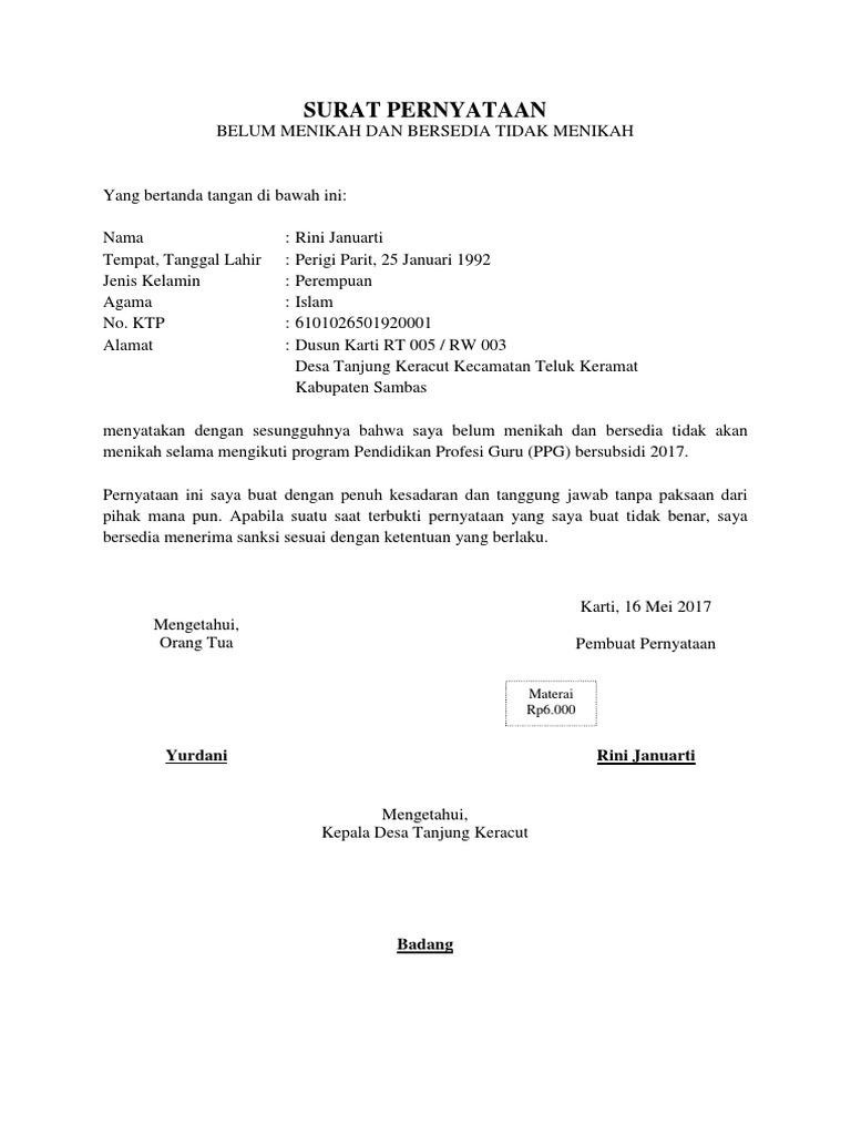 Surat keterangan tidak mampu merupakan surat yang dibuat untuk menyatakan atau menerangkan bahwa seseorang kurang mempunyai kemampuan atau kelebihan dalam aspek materiil di kehidupannya. Meski tidak wajib, namun berdasarkan uu no. Selain itu, surat pernyataan ini juga harus terdapat salam dan kalimat pembuka, isi, dan juga salam maupun kalimat penutup. 24 tahun 2013 bahwa setiap penduduk harus memiliki surat keterangan pindah. Selain itu, pemerintah juga menggunakan surat keterangan domisili sebagai pemetaan dari penyebaran penduduk. Surat pernyataan belum menikah dan sanggup tidak menikah selama mengabdi saya yang bertanda tangan di bawah ini: Belum menikah dan bersedia tidak menikah selama masa pemagangan. Tidak hanya bagi mahasiswa, karyawan juga bisa ikut kursus. Text of surat keterangan sudah menikah.docx. Telah mendapatkan persetujuan dari orang. Surat pernyataan tidak memiliki orang tua dan/ atau saudara kandung yang masih aktif bekerja di pt jasa raharja. Membawa surat pengantar dari desa / kelurahan. Surat pernyataan bersedia untuk tidak menikah selama menjadi peserta magang.